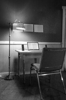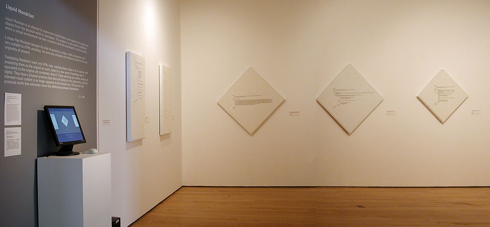 The project, Liquid_Mondrian, is an attempt to explore the transformation and migration of images and objects from the physical world to the cyberspace. This project is a site-specific installation in which a virtual environment has also been created to echo its counterpart in physical space. I chose Piet Mondrian’s painting as my subject based on several factors: he is widely recognized, his style of painting is unique, his painting is very suitable to encoding by HTML, and the Modernist movement of which he was part believed in the singularity of original artwork.