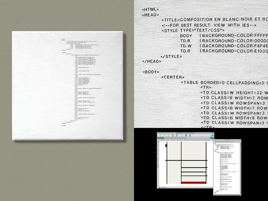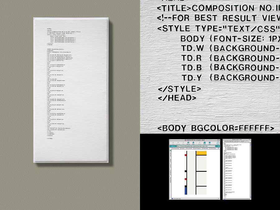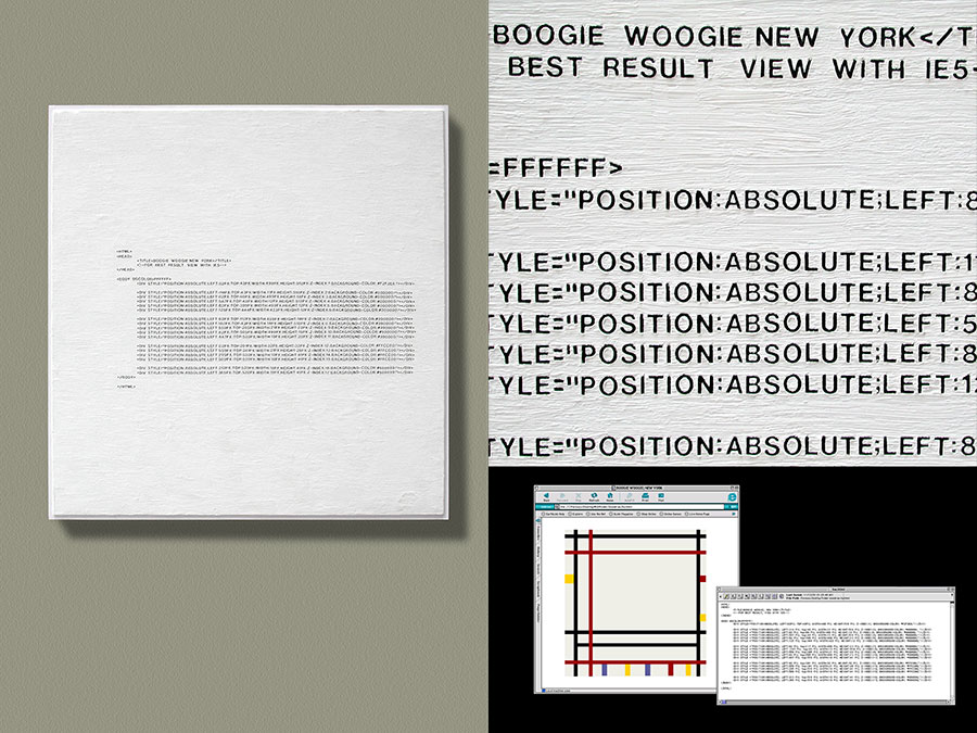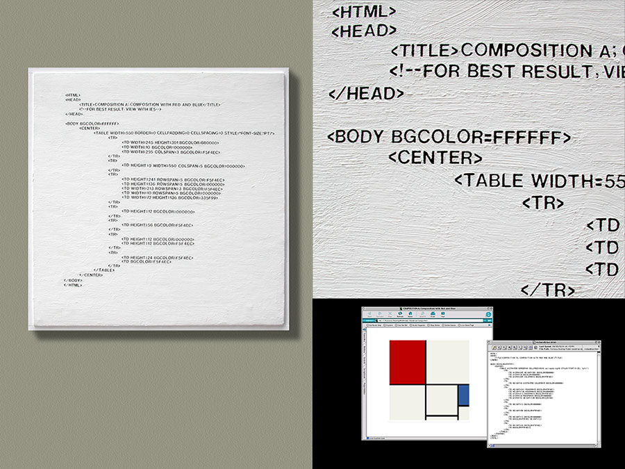 Translating Mondrian’s work into HTML code, and then materializing these codes using the same material, method, and presentation as the original, leads to a new series of painting in some sense equivalent to the original yet completely distinct in nature. These paintings are neither analog nor digital. They have the physical presence that does not belong to the cyber world, yet the intended visual content of these paintings is no longer apparent to the human eye. My process has produced works that ultimately mirror the differences between themselves.