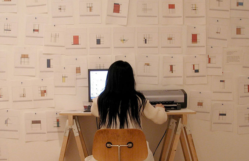 myData=myMondrian has an interface which replicates a sign-up form for an online dating site. Rather than fishing for friends, the result upon hitting “enter” is a quick “cyberization” of one’s personal stats and the subsequent creation of a geometric abstraction in the form of a Piet Mondrian-like composition.